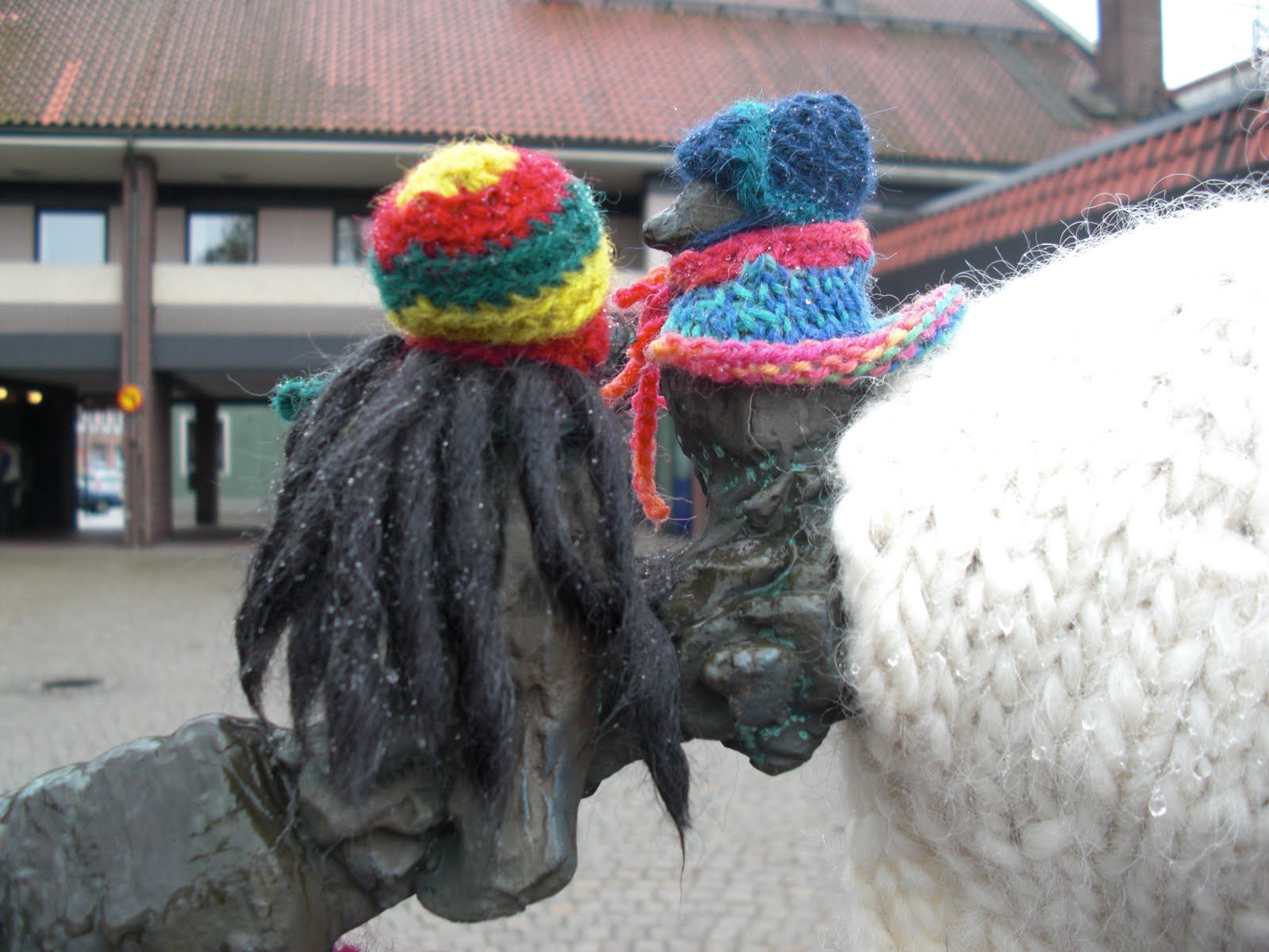 Laholm kallas "Den lilla staden med de många konstverken". Förra helgen kunde den som ville bege sig till Teckningsmuséet och sticka vad de ville. På söndagen gick de ut och klädde konstverken med sina stickningar. Det var meningen att kläderna skulle få sitta på t.o.m denna helgen, men det har blivit så uppskattat att man bestämt att de får sitta där en vecka till. Idag var jag tvungen att ta en promenad i det gråmulna vädret för att gå runt och beskåda verken och föreviga dem. Jag tycker de var så fina och ett kul inslag i den grå vardagen.